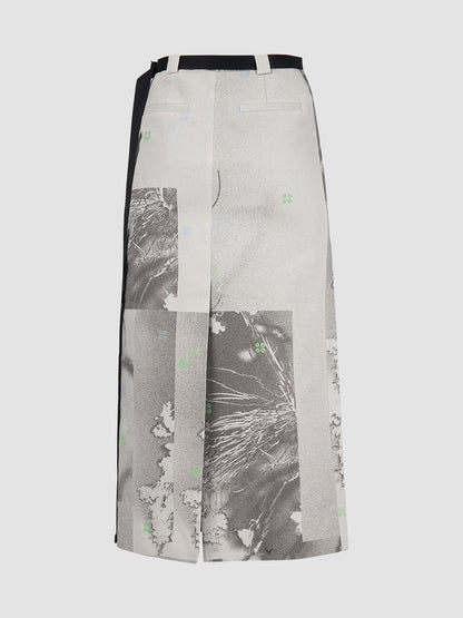 This long skirt features slit detailing at the front and back. New for the SS24 collection, the buckle is intricately engraved with the MINJUKIM symbol, enhancing its sleek silhouette. Specifically for this collection, we introduced a graphic fabric in tulle that portrays a mosaic of fading and crumbling images, adding allure to the garments.