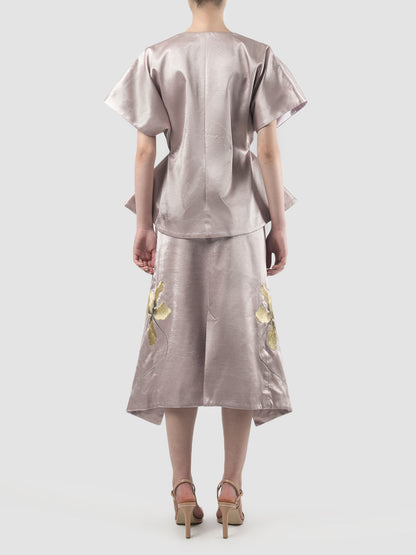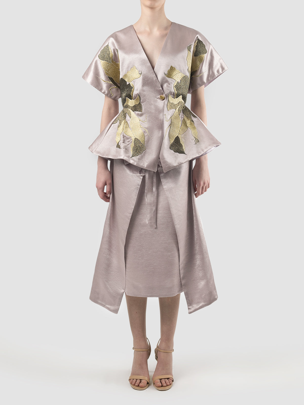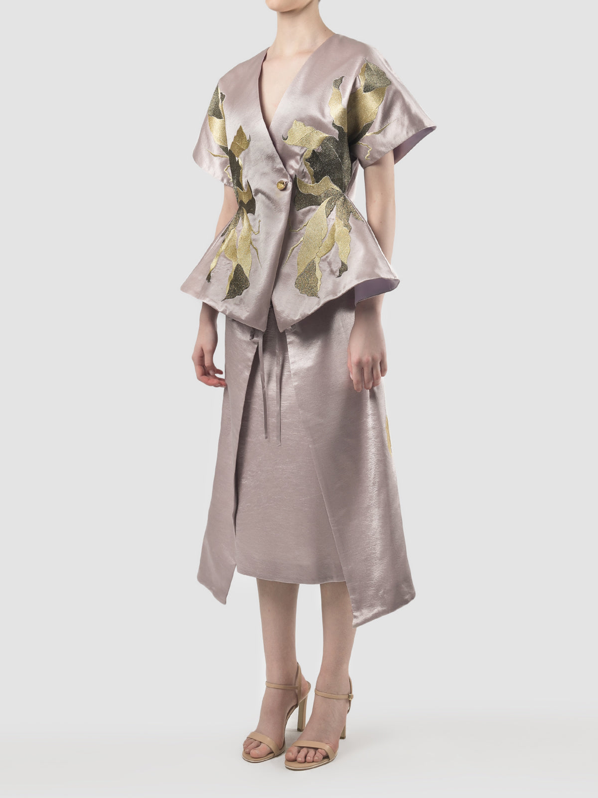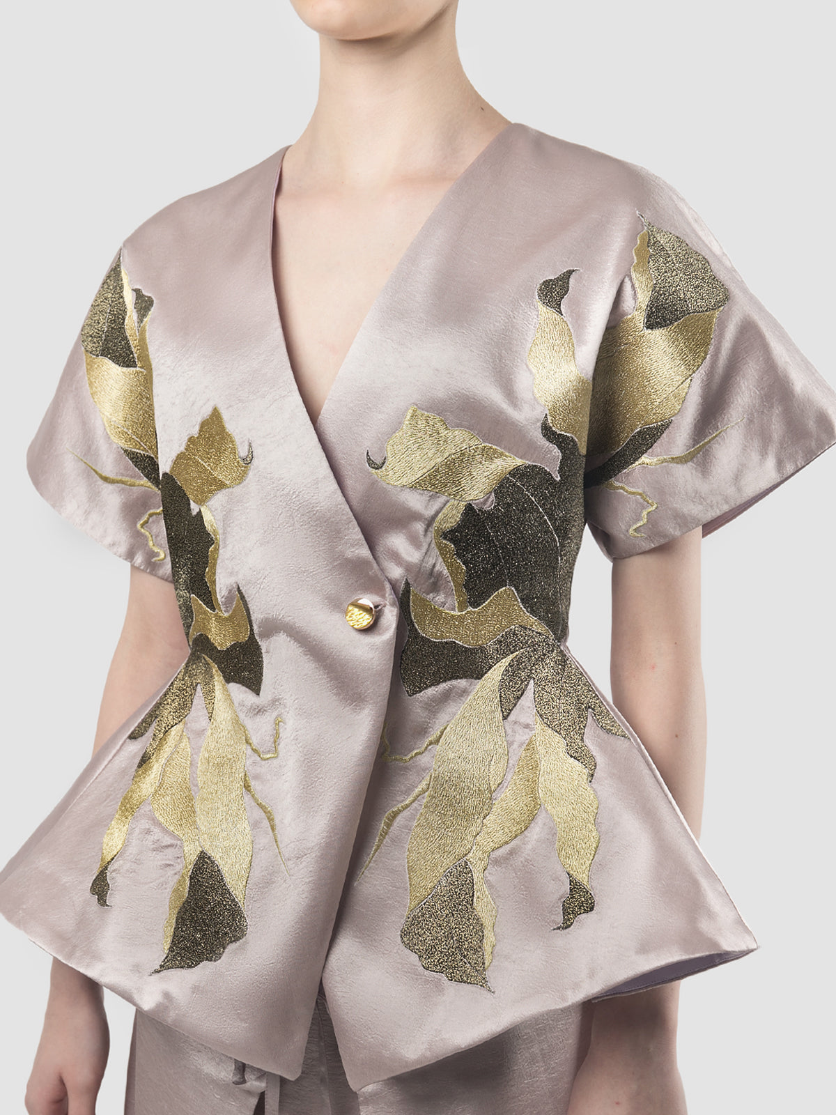 The elegant lilac kimono is adorned with dainty black and gold floral embroidery on each side. The cinched waist and exaggerated peplum enhance your silhouette, while the gold round button closure at the front adds an extra touch of refinement.