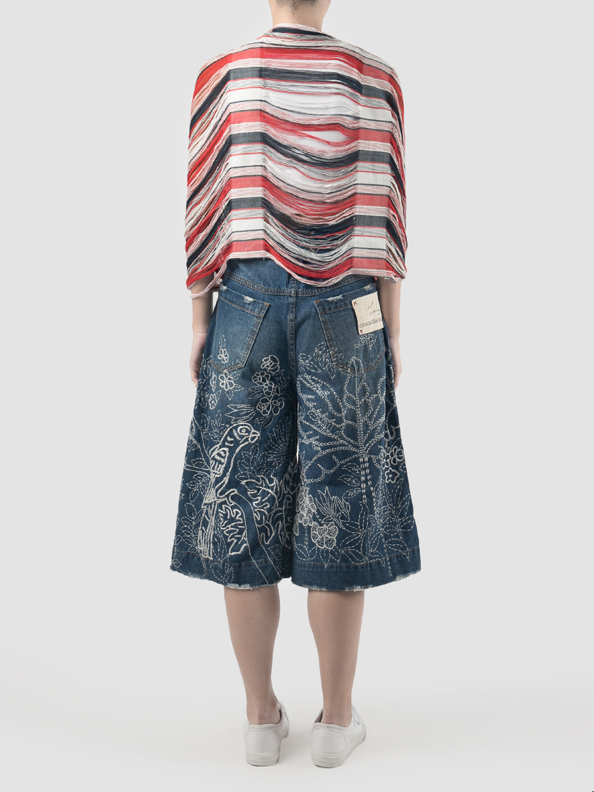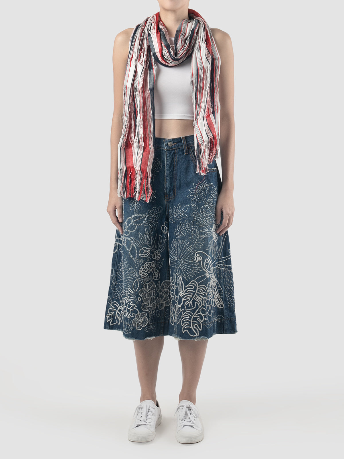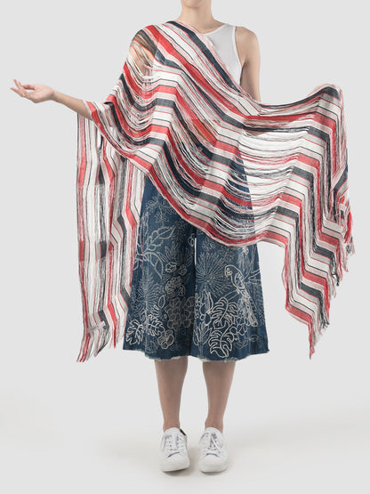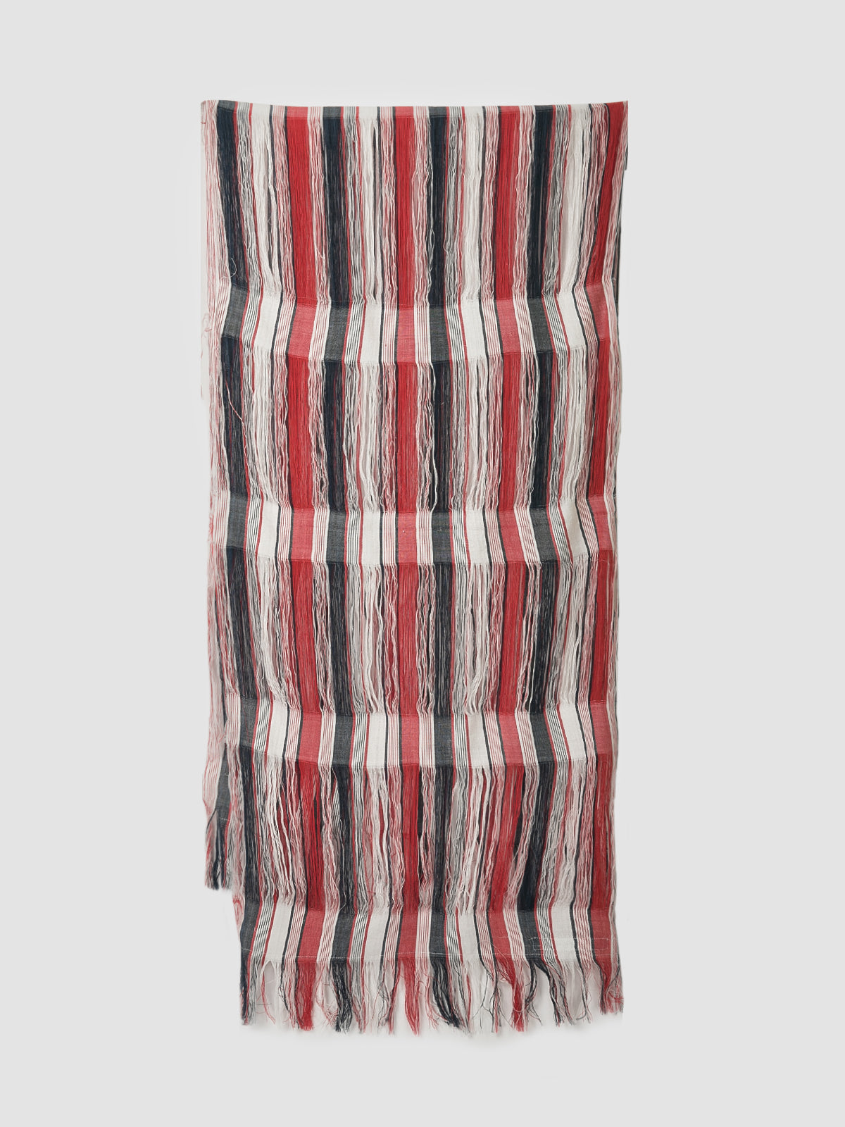 This semi-transparent scarf features a classic lurik pattern and adds a touch of elegance to any outfit. The fringe details provide a subtle unfinished touch to your look.