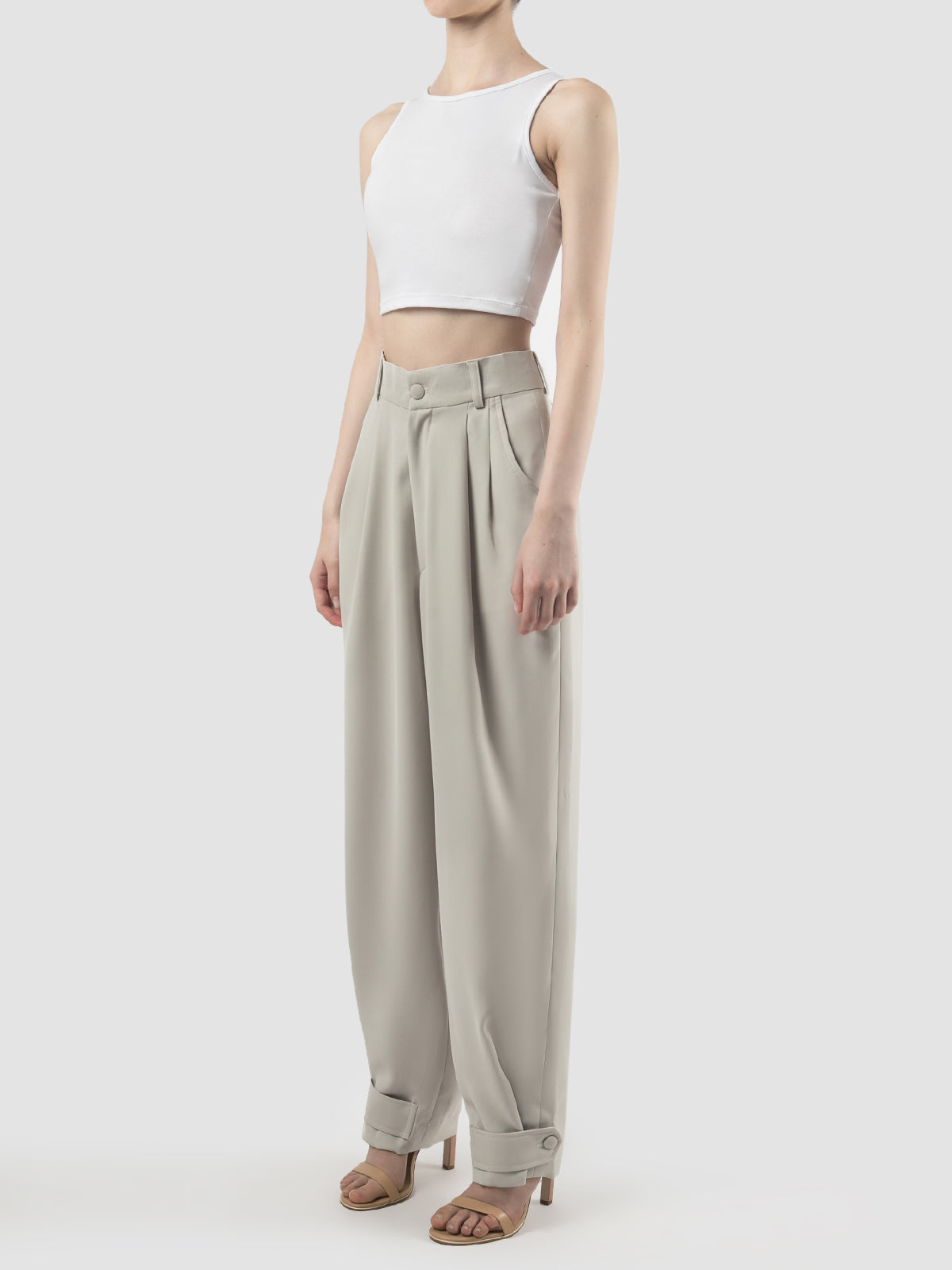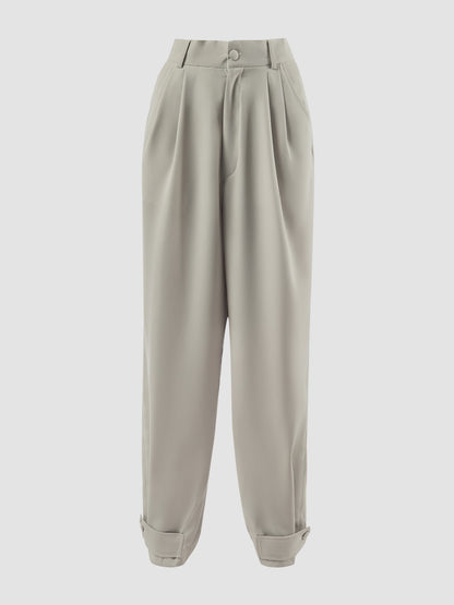 The Suki pants are tailored wide pants with a slightly baggy fit, featuring a pleated waist and ankle belt accents to cinch the hemline. Front button and zipper opening for ease of wear, plus side pockets for added functionality.