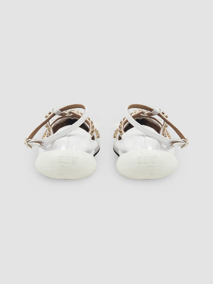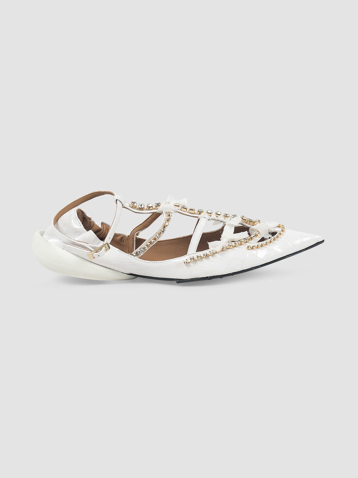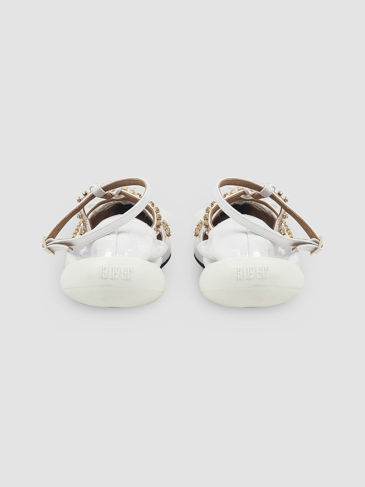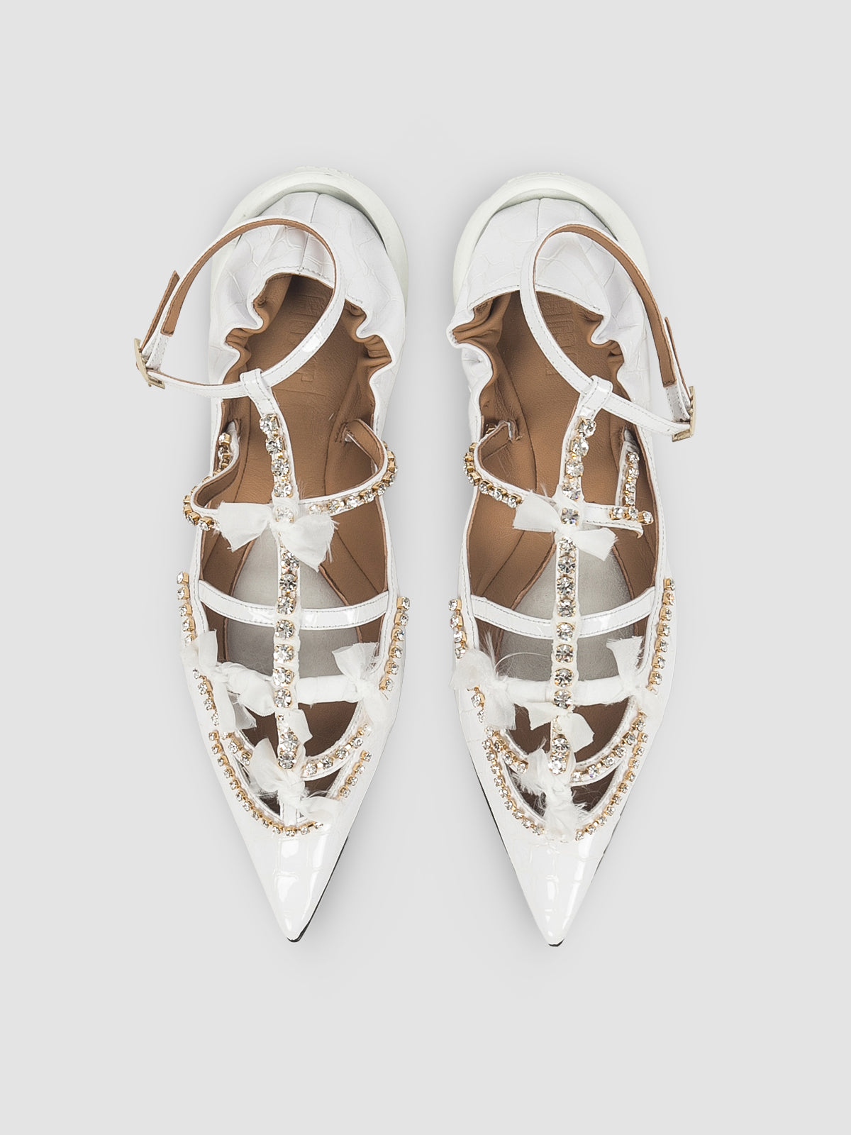 Handcrafted ballerina flats with straps. Decorated with recycled ribbons, Italian fabric scraps, and crystals. Imperfections in bows and ribbons are part of the handcrafted process, making each piece unique.