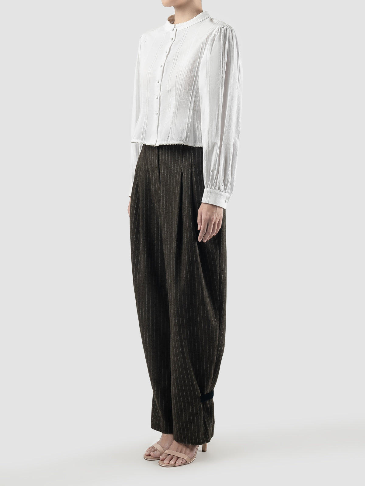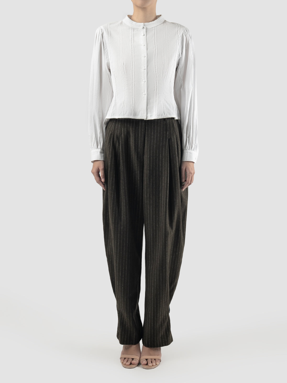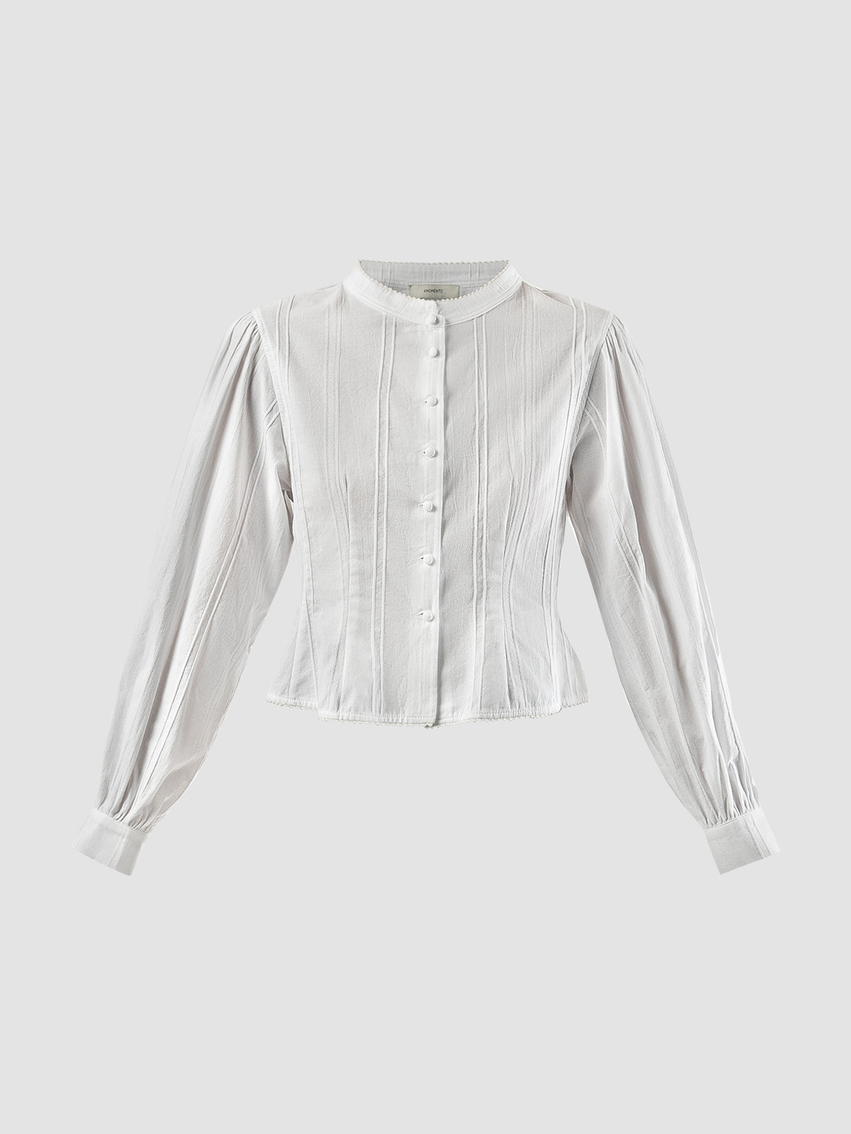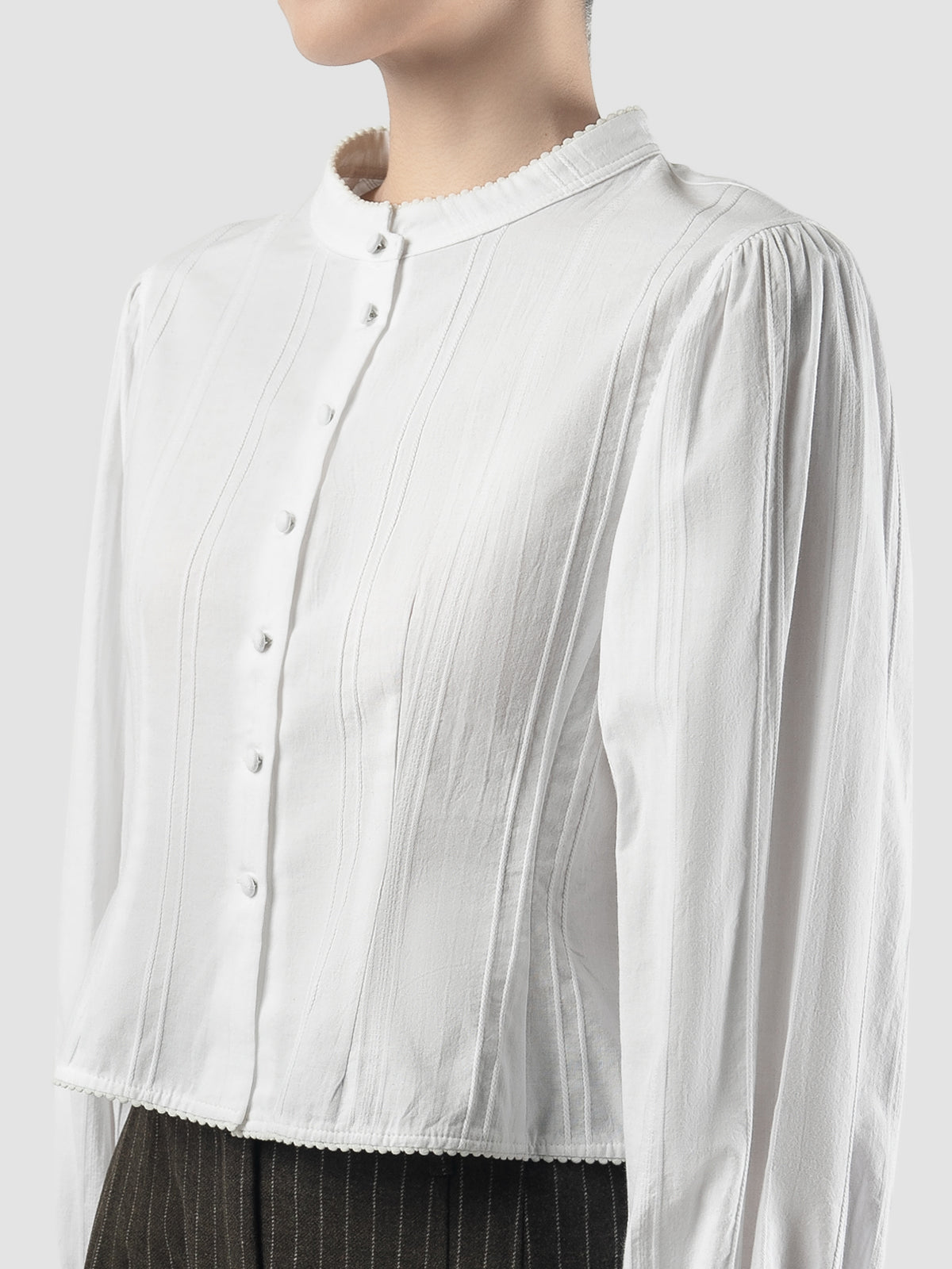 This elegant shirt showcases a mandarin collar beautifully adorned with lace trim.