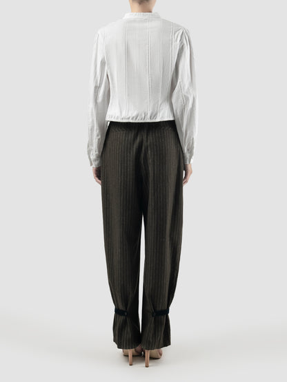 The front button placket adds a classic touch, while delicate lace accents on the cropped hem and cuffed long sleeves create an air of timeless sophistication.
