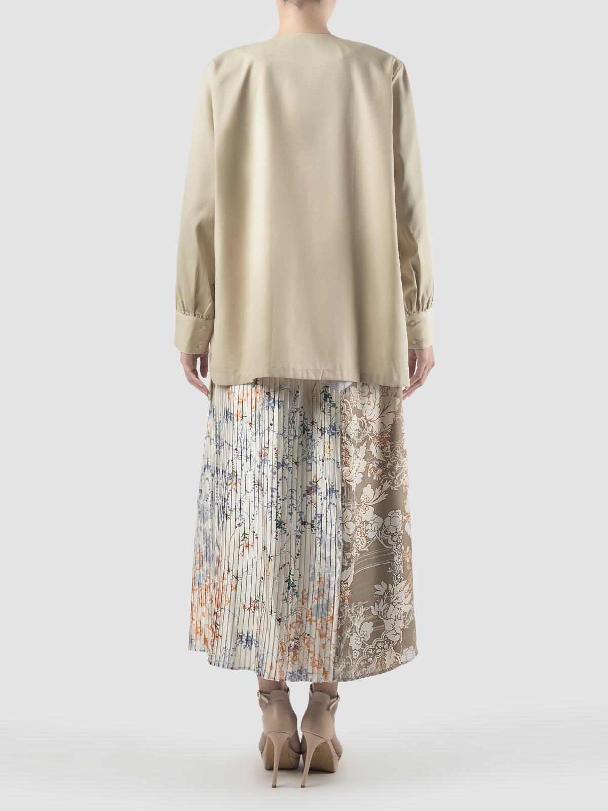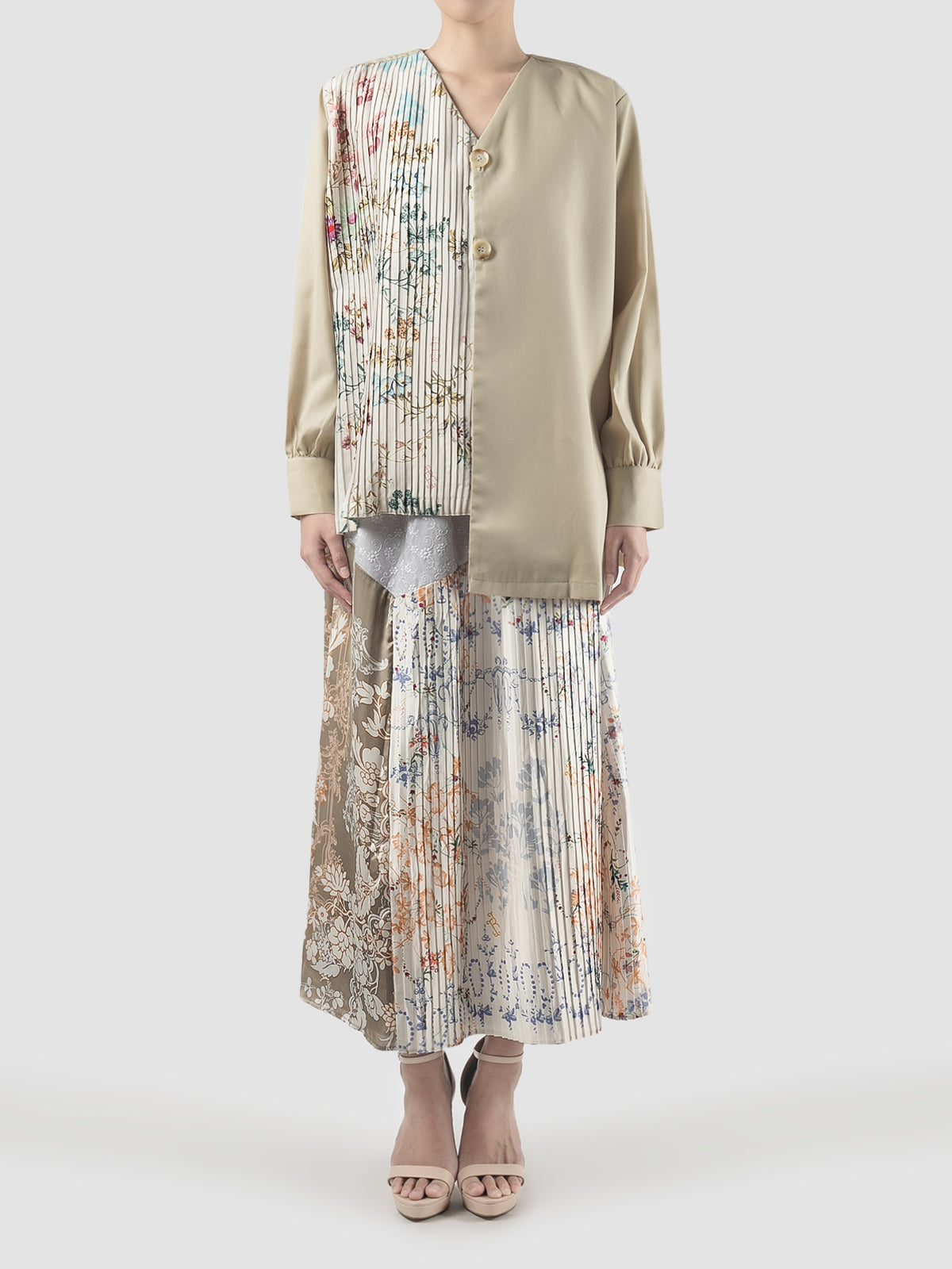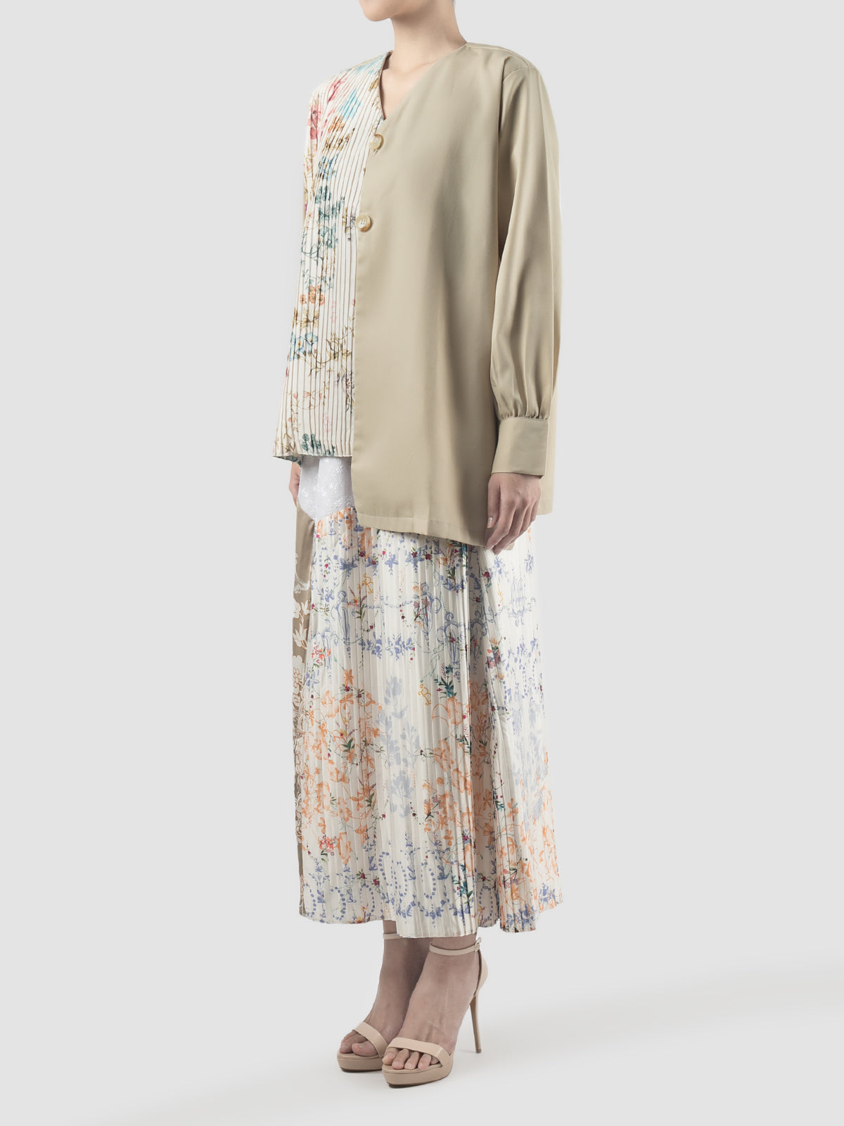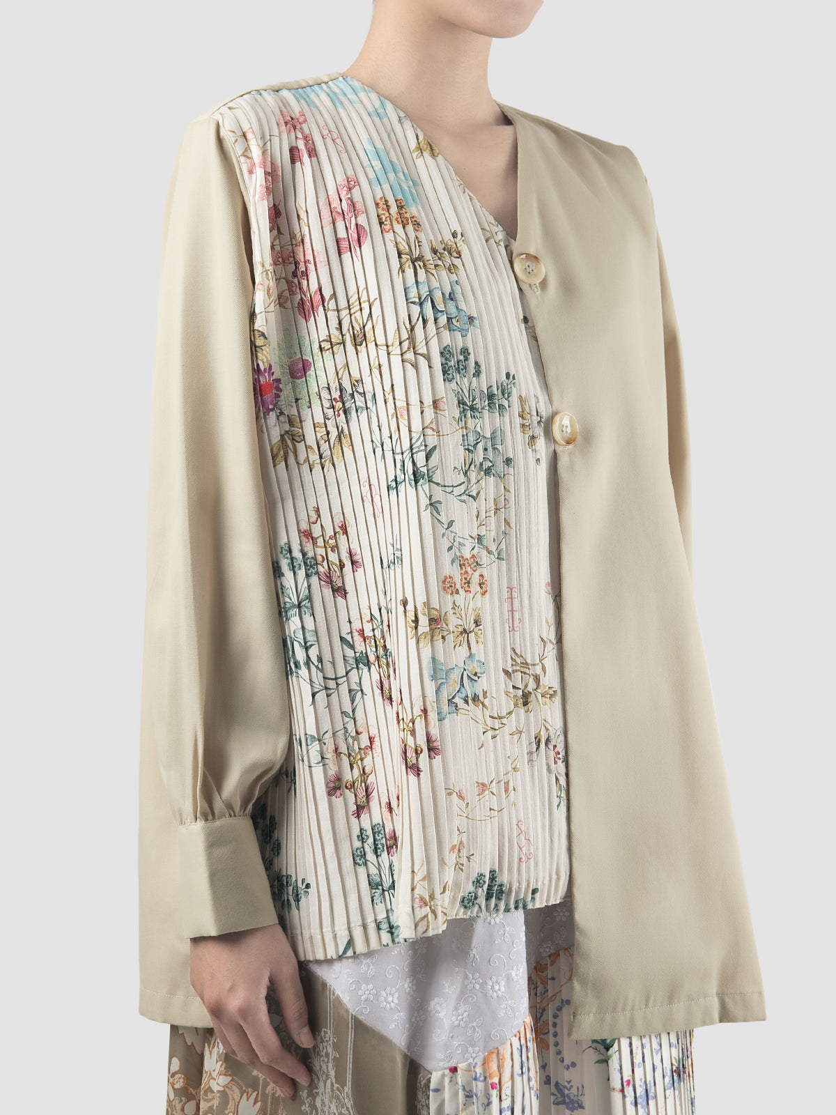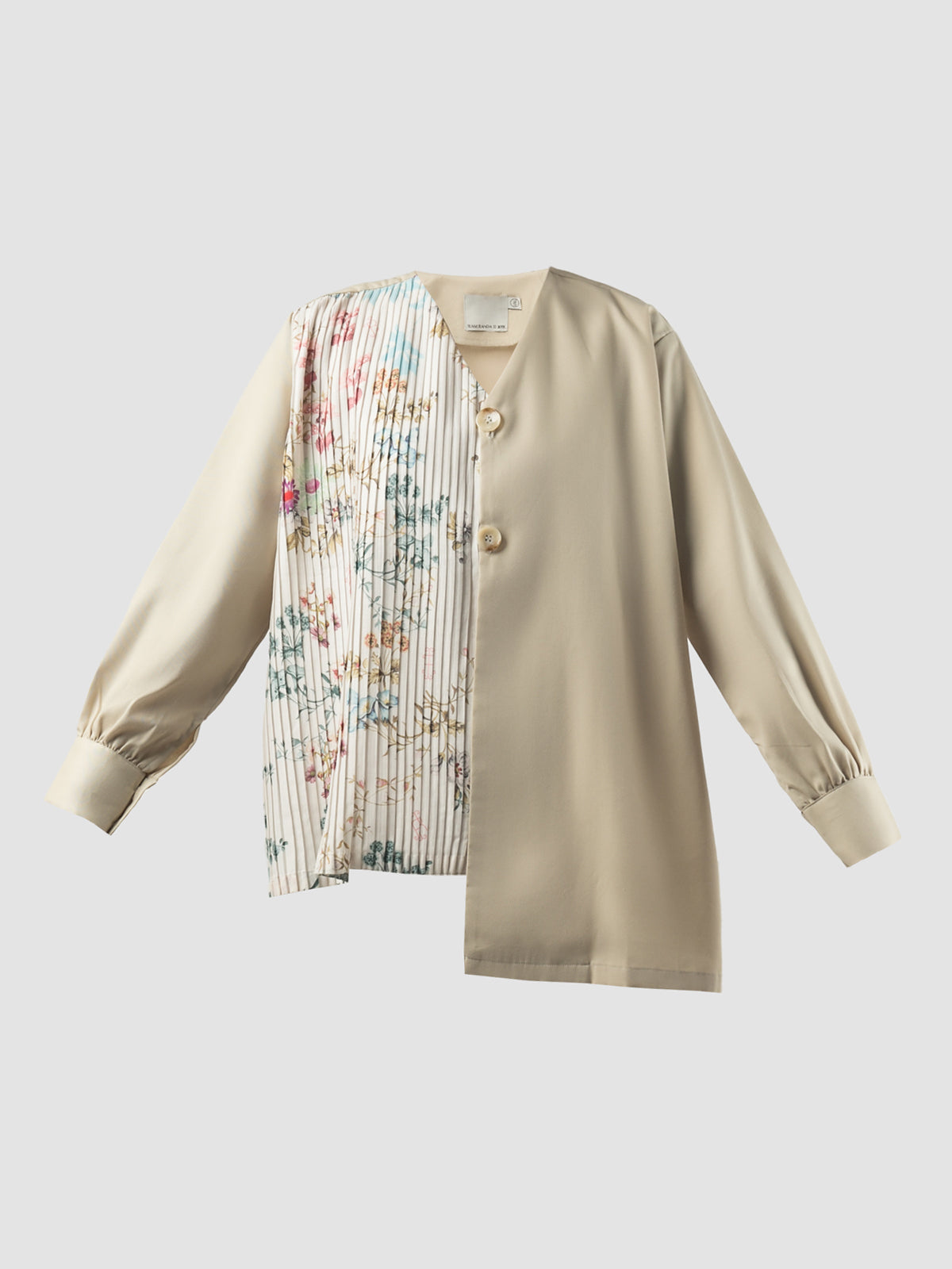 With one side plain and the other side adorned with printed floral patterns, this asymmetrical outer features side pleats detail and V-neck with a front button opening.