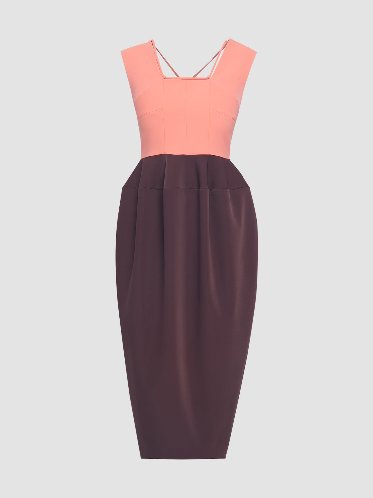 This sleeveless dress is cut for a maxi length. It features square neckline with strap detail and contrast panelled cocoon skirt with high back vent. Invisible zip closure at back. Fits true to size.