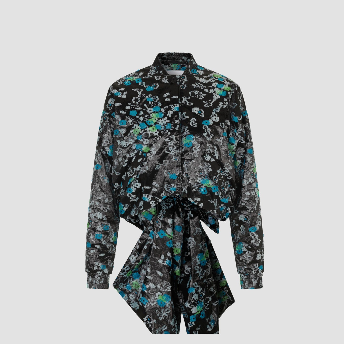 This cloud-like bomber merges sportive elements with hyper-femininity through delicate floral embroidery in aqua, grey, and green on a yarrow fil-coupé base.