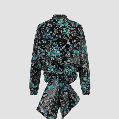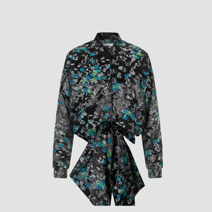 An embodiment of practical everyday couture, the jacket dons a dramatic bow draped at the back and comes with a zip closure.