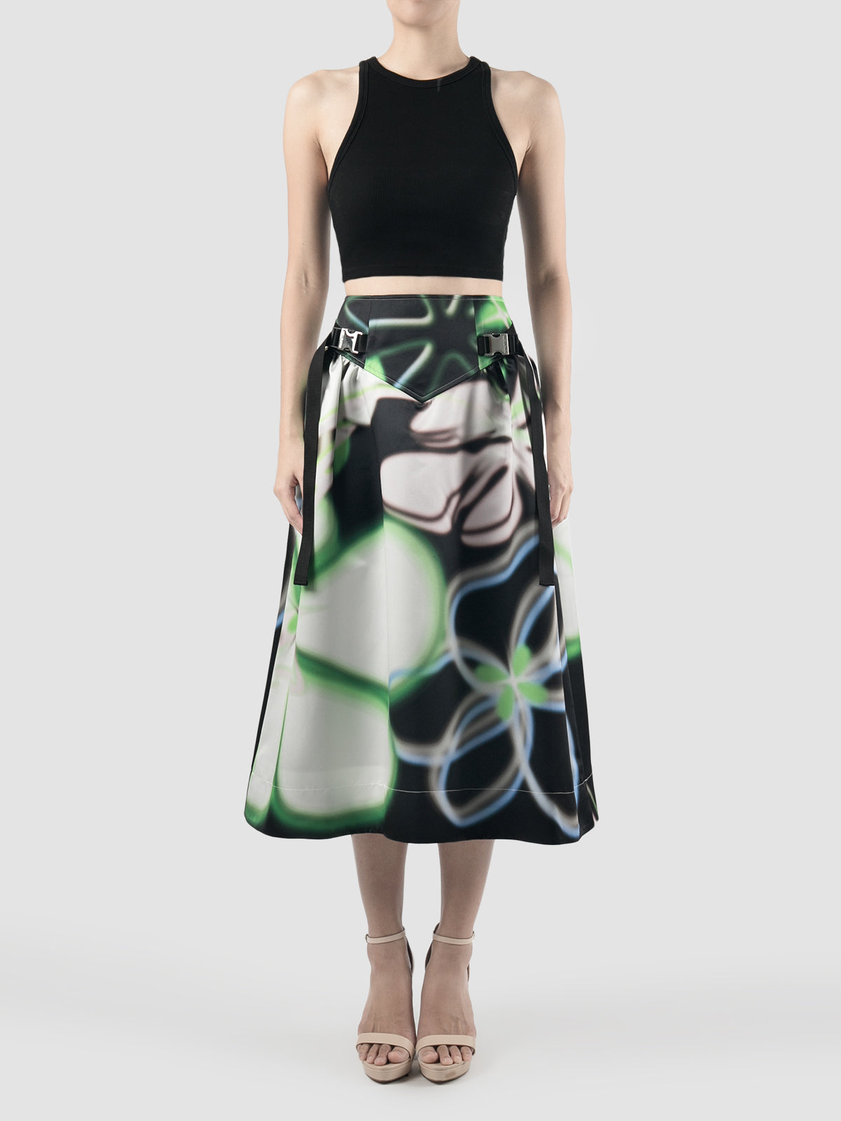 The calf-length skirt is designed to fit snugly around the waist with a V-line panel and flares out to a voluminous bottom. It features a back zipper opening and release buckle accents on each side.