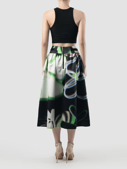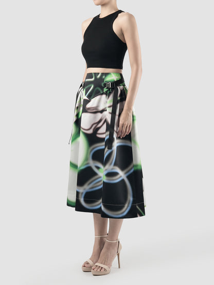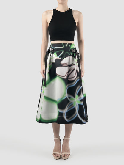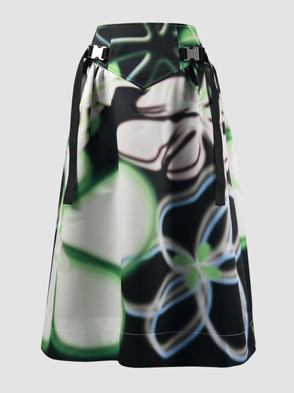 V-cut Buckle Black Flare Skirt with Floral Prints