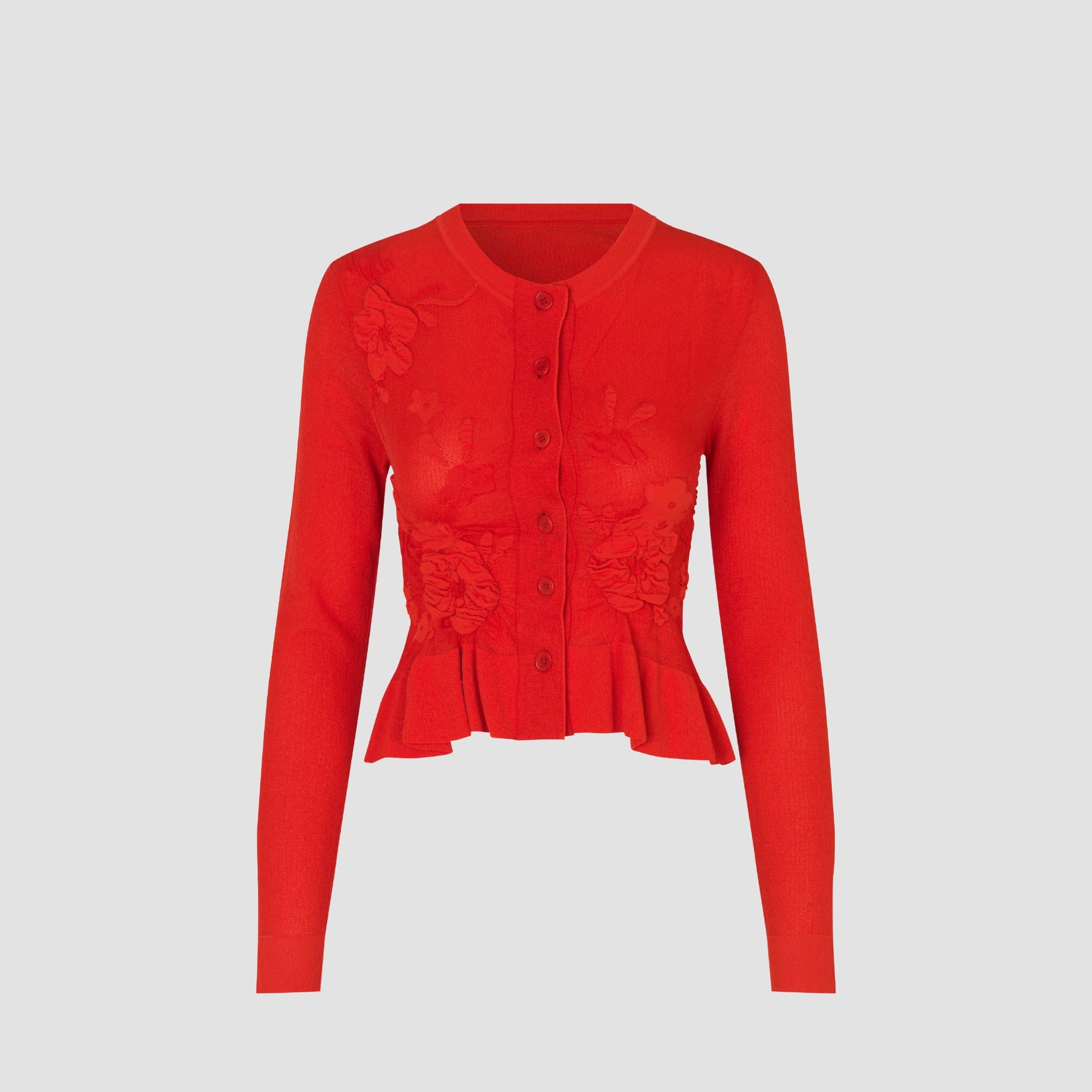The cardigan is cropped, featuring tactile florals that create a textured base, a hallmark of Bahnsen's unmistakable style.