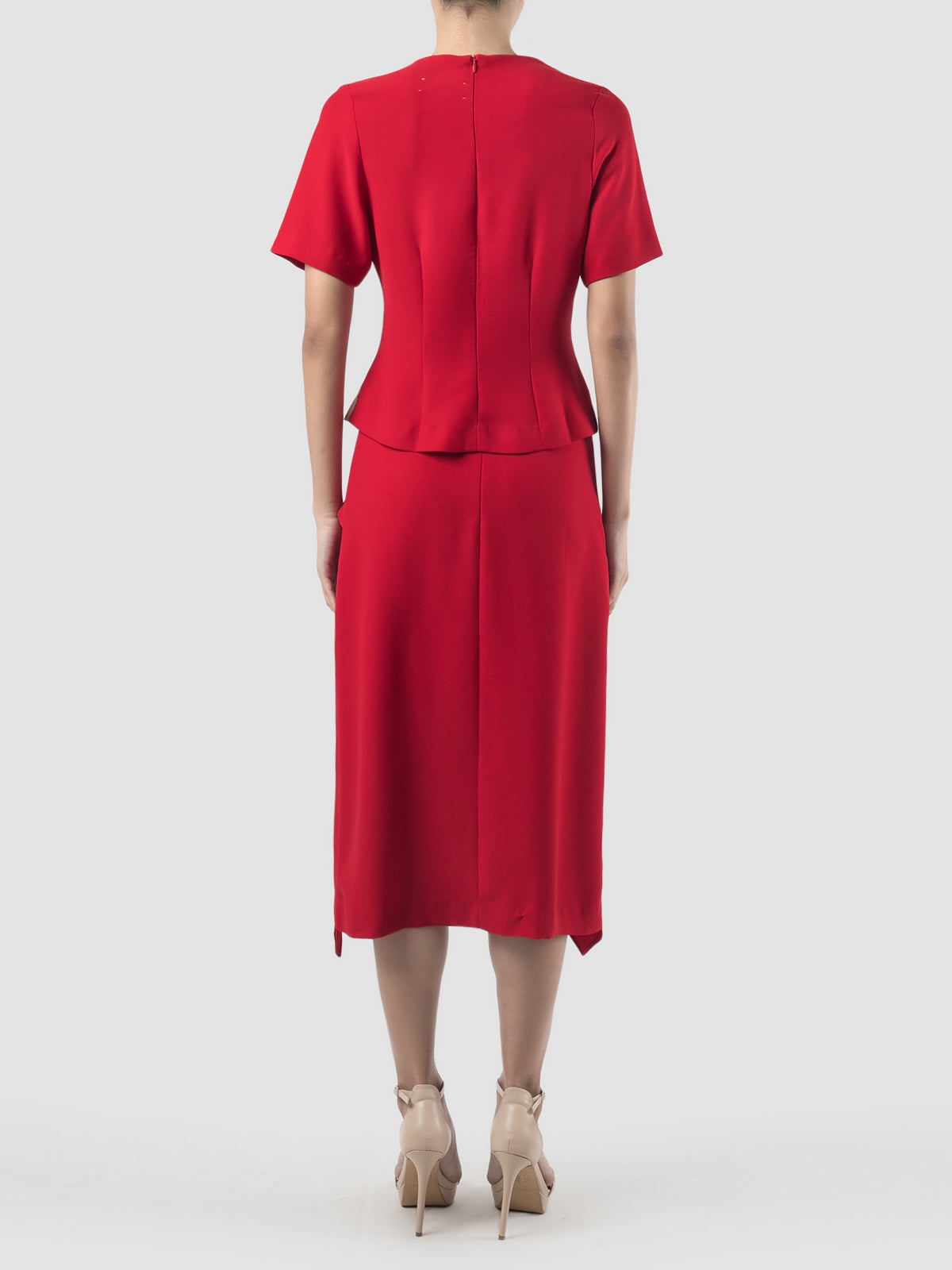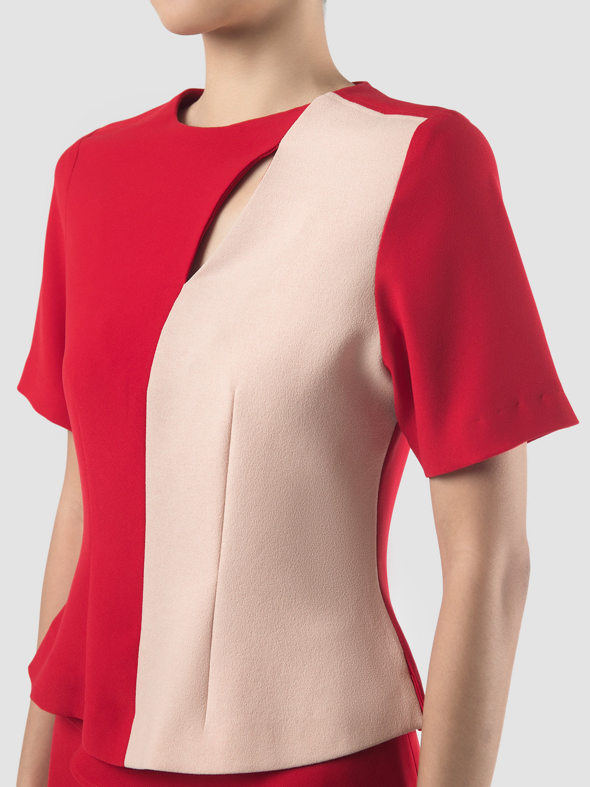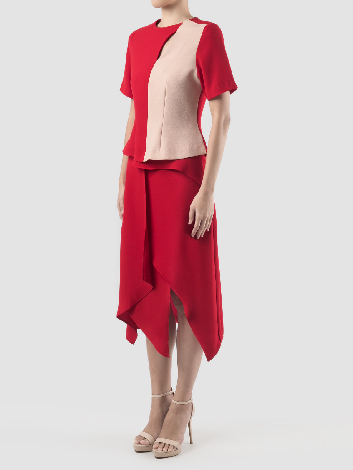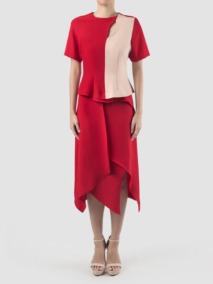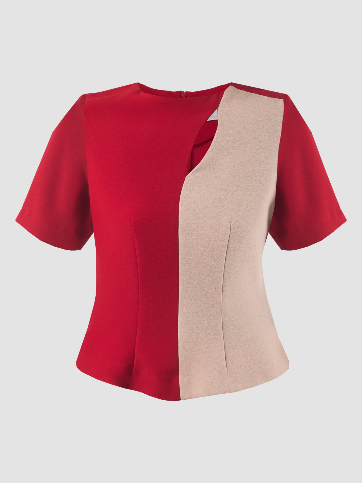 A unique and stylish piece that blends contrasting colors seamlessly. With a bold red left front and a delicate blush pink right front, this blouse is a statement of its own.