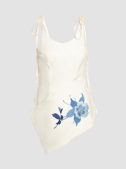 A jacquard tank top showcasing a blue floral embroidery and a peplum hem with a slashed design.